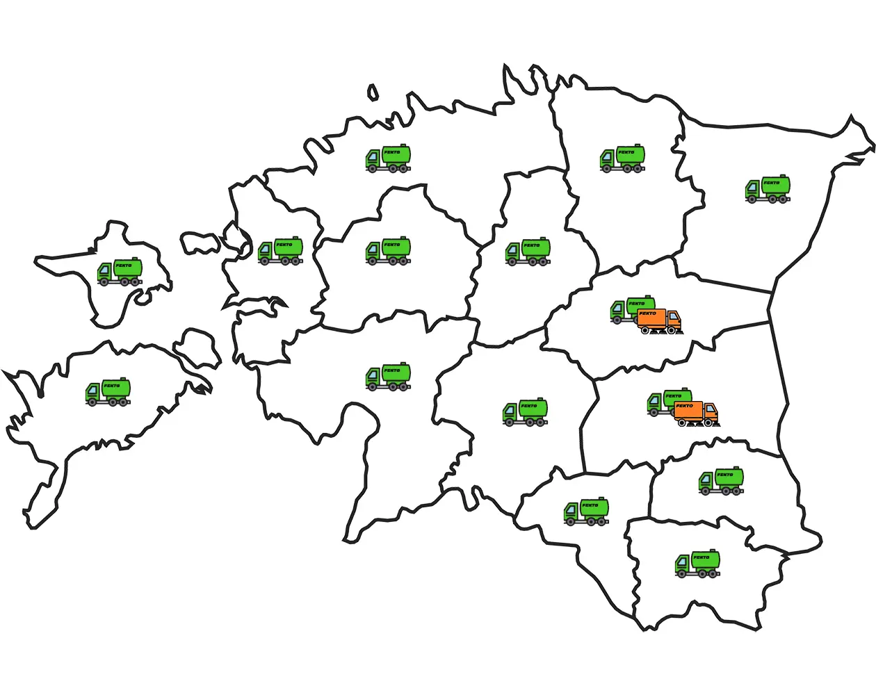 Meie piirkonnakeskused asuvad Harjumaal ja Tartus, teostame fekaalivedu Tallinnas, Viimsis, Saue, Saku, Harku, Kohila vallas, Jõelähtmel, Laulasmaal, Keila vallas, Märjamaal, Raplamaal, Viljandis ja Viljandimaal, Jõgevamaal, Võrus ja Võrumaal, Põlvamaal, Elvas.